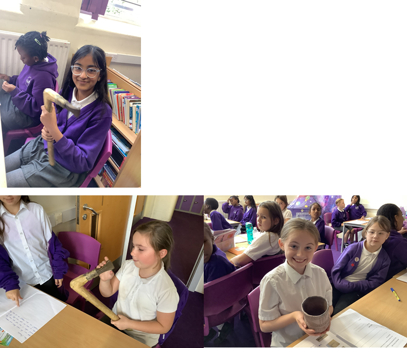 History: After studying the Stone Age all term, Kestrels got excited about their Bronze Age learning ahead of Term 2 by looking at replicas of artefacts from that time, including an axe, an axe head, a bronze pot and a clothes pin.