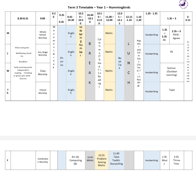 Outdoor learning is every alternate Wednesday and you will receive a text beforehand so appropriate clothing can be brought in. PE is every Tuesday afternoon.