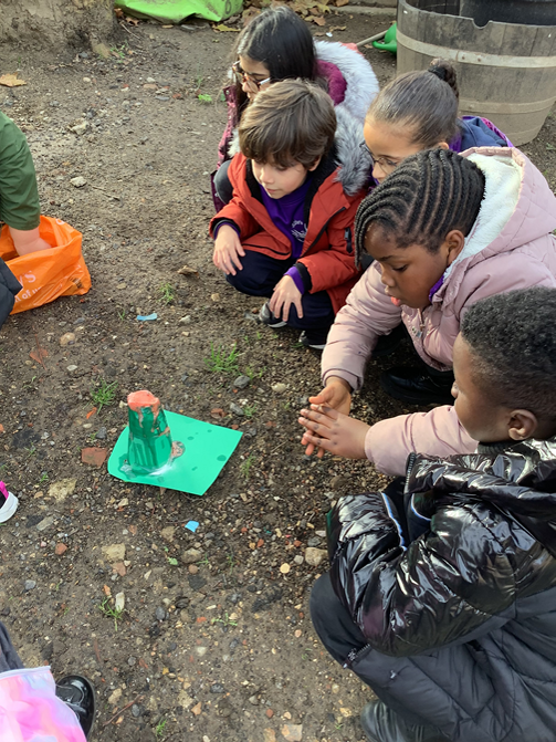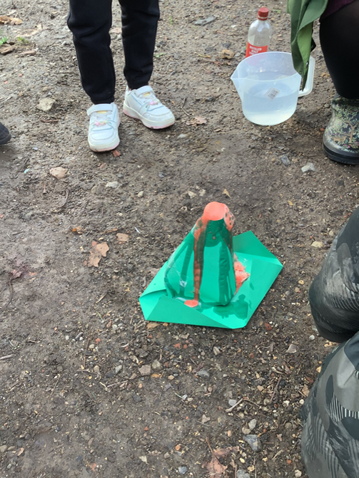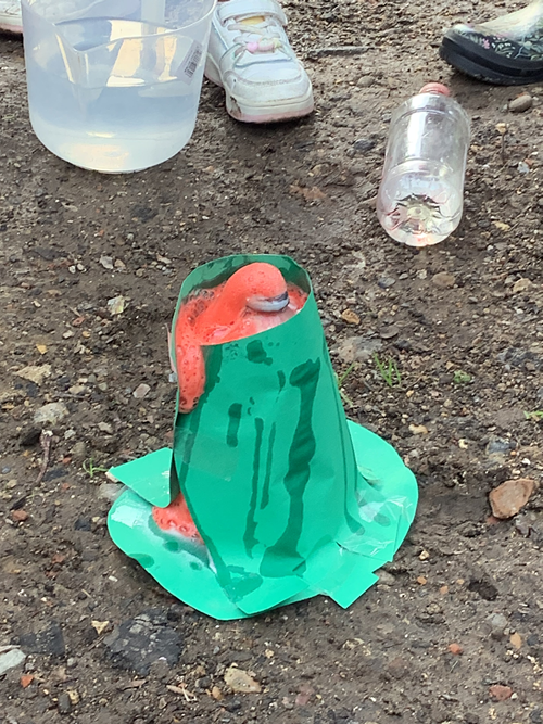We took our learning outside when we made our own volcanoes and made them ‘erupt’ by adding bicarbonate of soda, vinegar, red food colouring and washing up liquid. We also looked at the different types of soil that are around our school grounds.